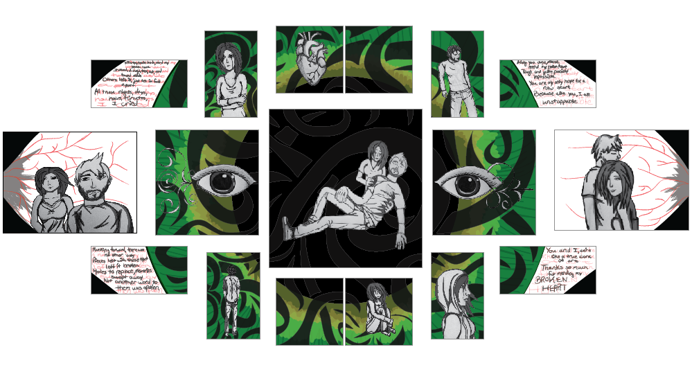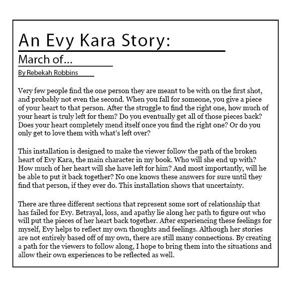 Evy Kara has been a novel that I started back in the seventh grade. It has been a way of expressing myself for many years, and I thought it only fitting to branch out while getting my art degree. Creating artwork that related to this large part of my life has been amazing, and I hope to continue.
